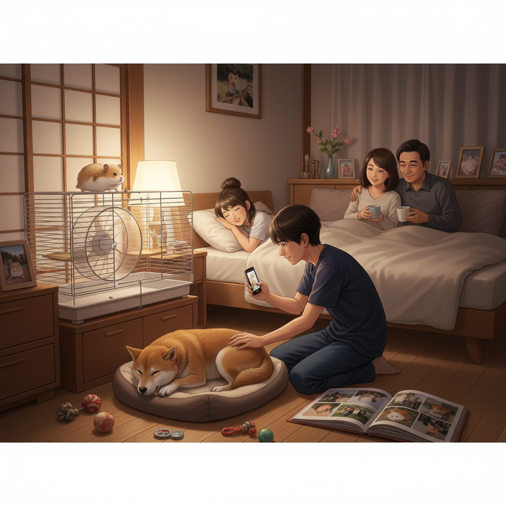 夜、寝る前にリビングの電気を消すとき、ポテトのケージとマメのベッドを見る。二匹とも寝てて、静か。この時間だけは穏やかで、ちょっとほっとする。明日もまた賑やかな一日が始まるんだろうけど、それはそれで悪くない…って思いながら、階段を上がる。