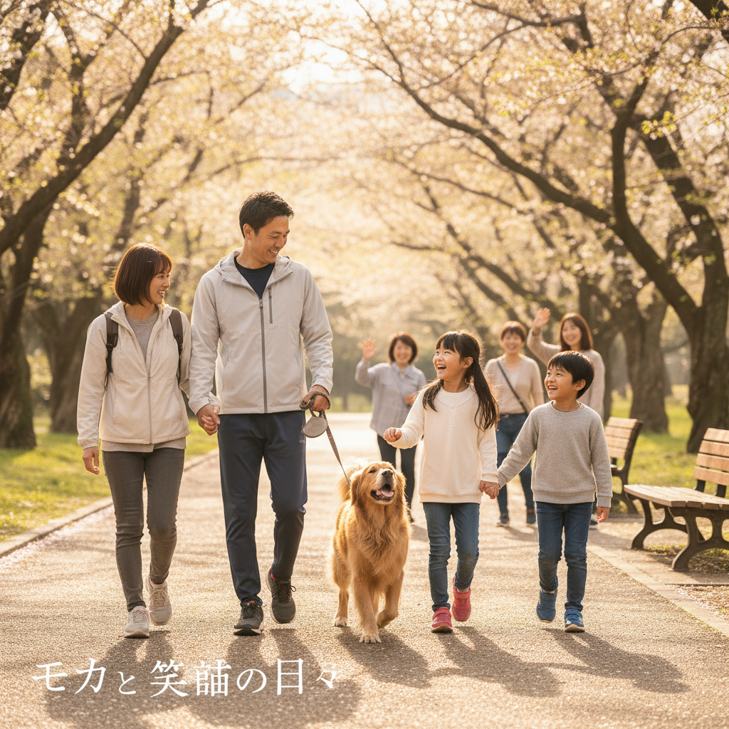 最近では、近所の方から「いつも仲良く散歩している姿を見ていると、癒されるわ」と言っていただくことも。確かに、モカがいることで私たち家族はより笑顔になれています。